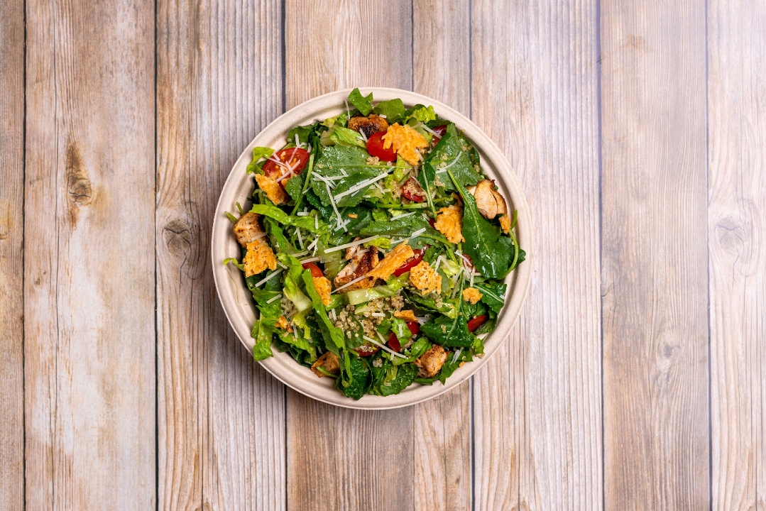 not your ordinary caesar - grilled chicken breast • sliced cherry tomatoes • shredded parmesan cheese • warm seasoned quinoa • house made parmesan crisps • baby kale • shredded romaine • classic caesar dressing on the side