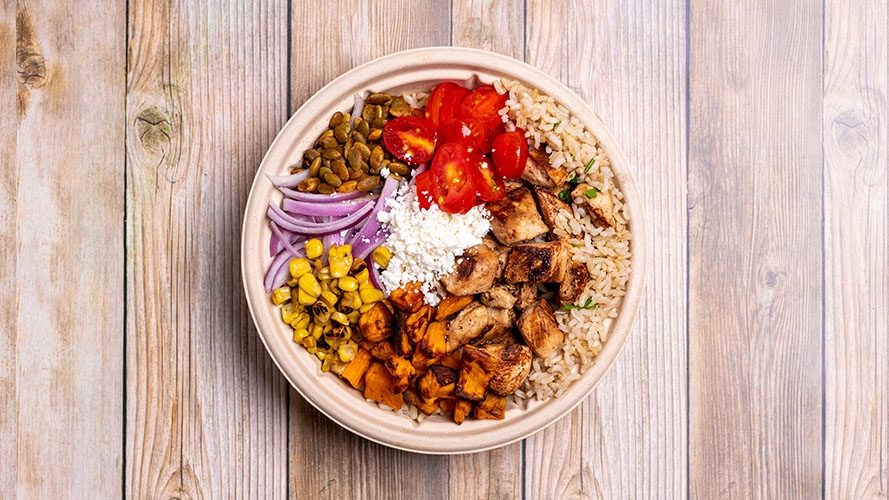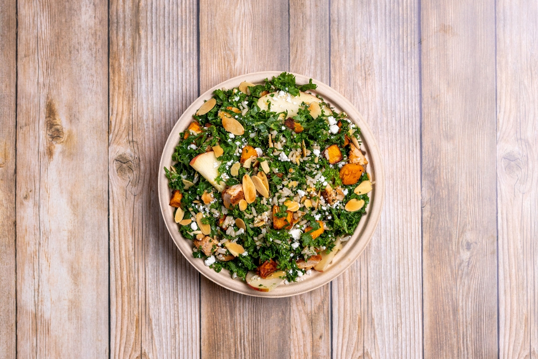 a bowlful of comfort - signature grilled chicken • warm roasted sweet potatoes • gala apples • goat cheese • toasted almonds • shredded kale • warm seasoned brown rice • balsamic vinaigrette on the side