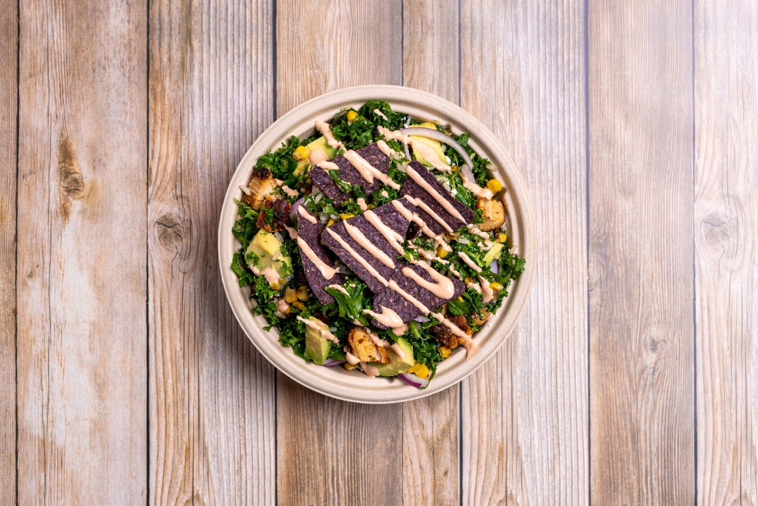 a savory taste of the southwest - signature grilled chicken • warm seasoned black beans • fire roasted corn • avocado • feta cheese • red onion • corn tortilla chips • shredded kale • warm seasoned brown rice • cilantro lime or spicy jalapeno dressing and honey sriracha drizzle on the side