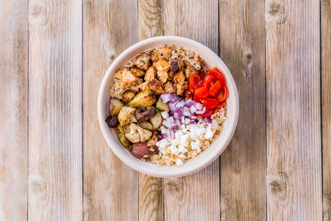an ode to the farm - grilled chicken breast • choice of grain • classic roasted veggies • red onion • sliced cherry tomatoes • feta cheese • balsamic drizzle on the side