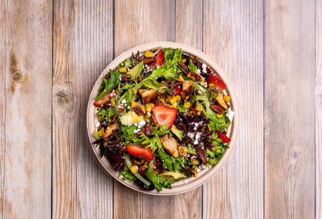fresh and fruitful - fresh strawberries • feta cheese • fire roasted corn • avocado • spiced pecans • baby lettuce blend • lemon basil vinaigrette on the side