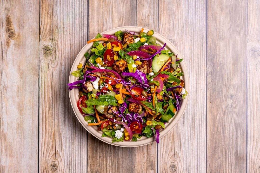 hearty, tangy and herby - chili lime tofu • cucumbers with pickled onions • feta cheese • lentils • shredded romaine • shredded red cabbage • fire roasted corn • spicy pumpkin seeds • shredded carrots • cherry tomatoes • mediterranean vinaigrette • lemon tahini drizzle on the side