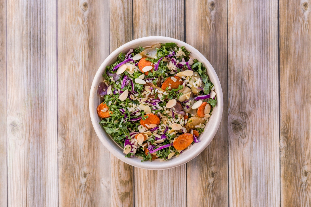 for the umami seeker - warm roasted root vegetables • shredded red cabbage • toasted almonds • shredded kale • warm seasoned brown rice • honey ginger dressing on the side