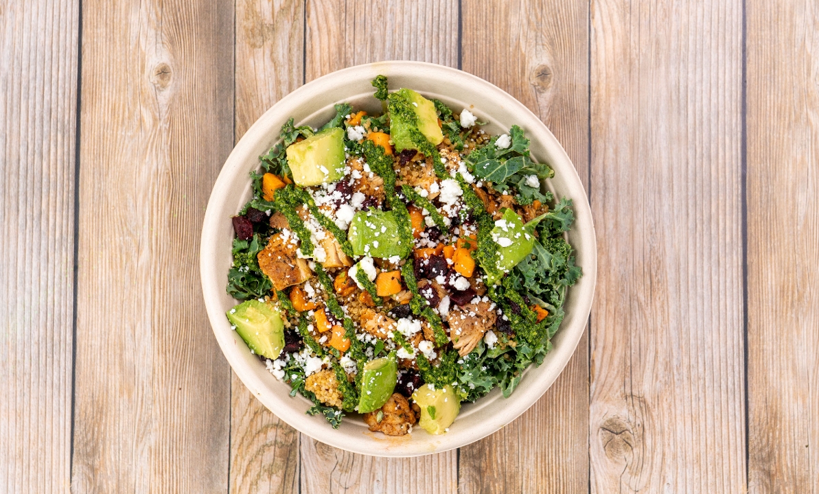 earthy and light - signature grilled chicken • warm roasted sweet potatoes • red onion • roasted beets • avocado • goat cheese • shredded kale • warm seasoned quinoa • basil pesto sauce • lemon tahini dressing on the side