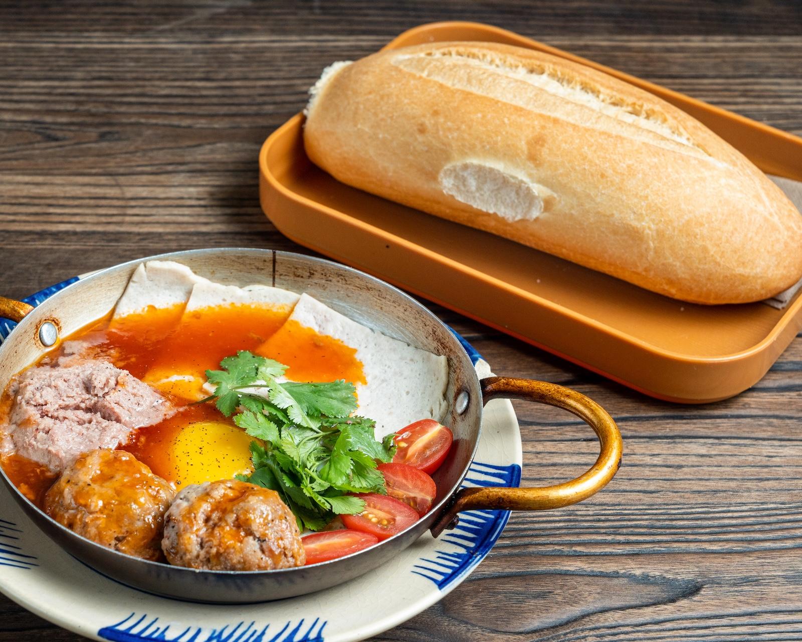 Homemade meatball , Vietnamese ham, sunny side up egg*, pate. Comes with bánh mì.