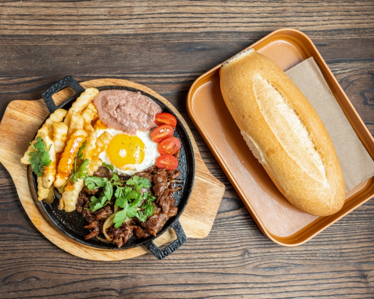 Sizzling beef with pate, French fries, sunny side up egg* served on cast iron. Comes with bánh mì